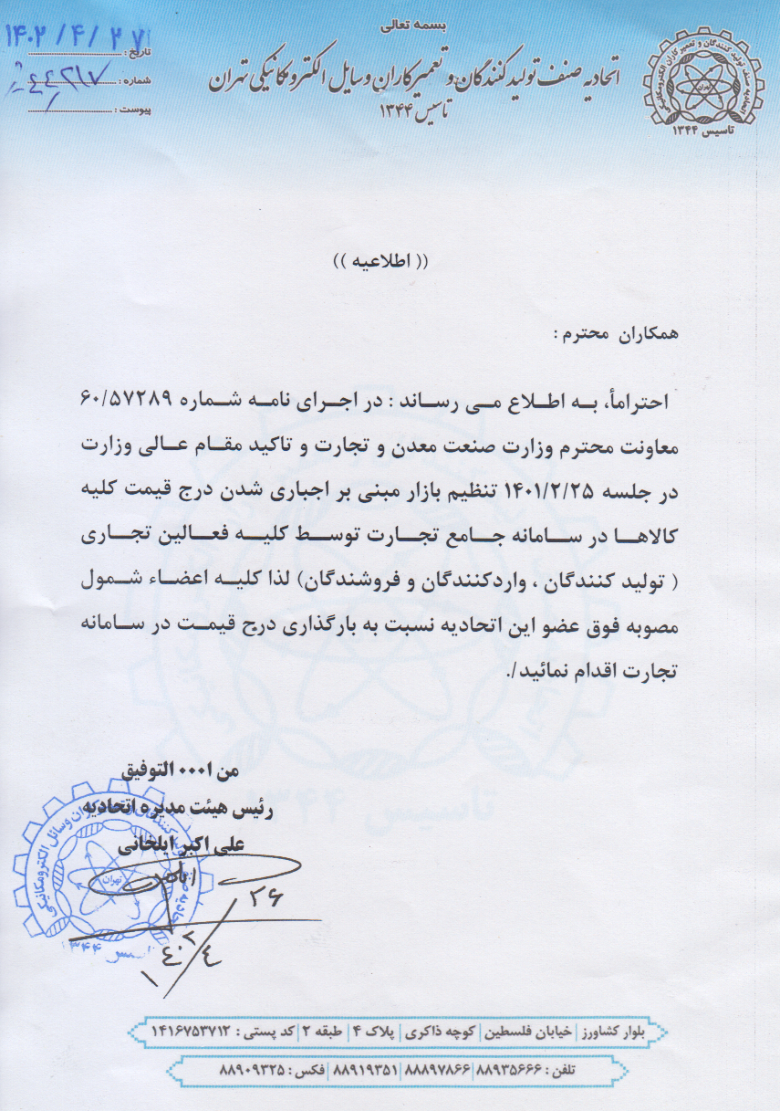 احتراما، به اطلاع می رساند : در اجرای نامه شماره ۶۰/۵۷۲۸۹ معاونت محترم وزارت صنعت معدن و تجارت و تاکید مقام عالی وزارت در جلسه ۱۴۰۱/۲/۲۵ تنظیم بازار مبنی بر اجباری شدن درج قیمت کلیه کالاهای در سامانه جامع تجارت توسط کلیه فعالین تجاری (تولید کنندگان، وارد کنندگان و فروشندگان) لذا کلیه اعضا شمول مصوبه فوق عضو اتحادیه نسبت به بارگذاری درج قیمت در سامانه تجارت اقدام نمایید.